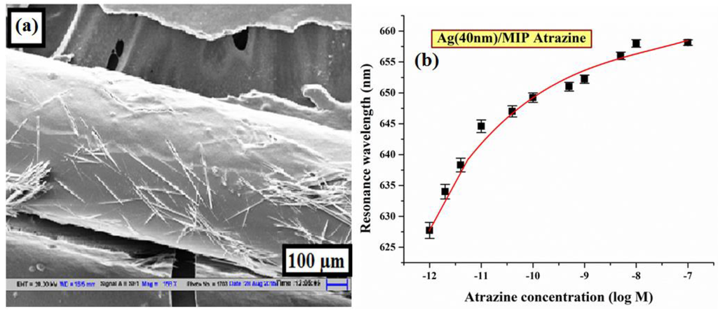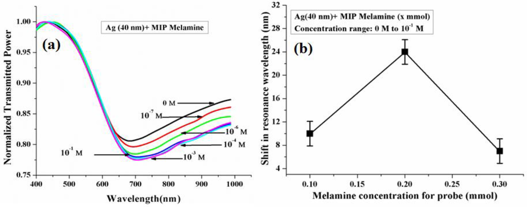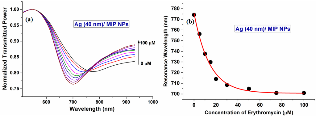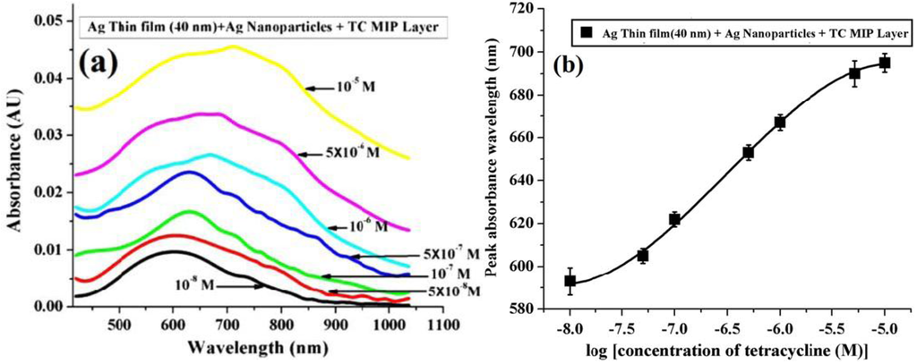 Tetracycline is a type of antibiotic which is used for the prevention and treatment of several bacterial infections such as acne, pneumonia, etc. [155,156]. However, large amounts of tetracycline may harm the human body via skin problems, allergic symptoms and skin diseases. Therefore, the monitoring of tetracycline is important to ensure food safety. A TC detection method using MIT and fiber optic SPR technique was reported [157]. The sensing probe was prepared by coating an Ag thin film over the core of the optical fiber followed by a MIP TC layer. MIP TC was synthesized in a polyacrylamide hydrogel medium where acrylamide (AM) and N,N-methylenebisacrylamide (BIS AM) were used as monomer and cross-linking agent while TC was used as template molecule. The sensor operation was checked for the TC concentration range 0–0.96 µM, and for the same concentration change the shift in resonance wavelength was observed to be 35.892 nm. Figure 9a,b show the SPR response and the shift in resonance wavelength for different concentrations of TC sample. Oxytetracycline (OTC) is also a member of the TC family. The detection of OTC was also shown in the same study for which OTC was used as template molecule instead of TC.