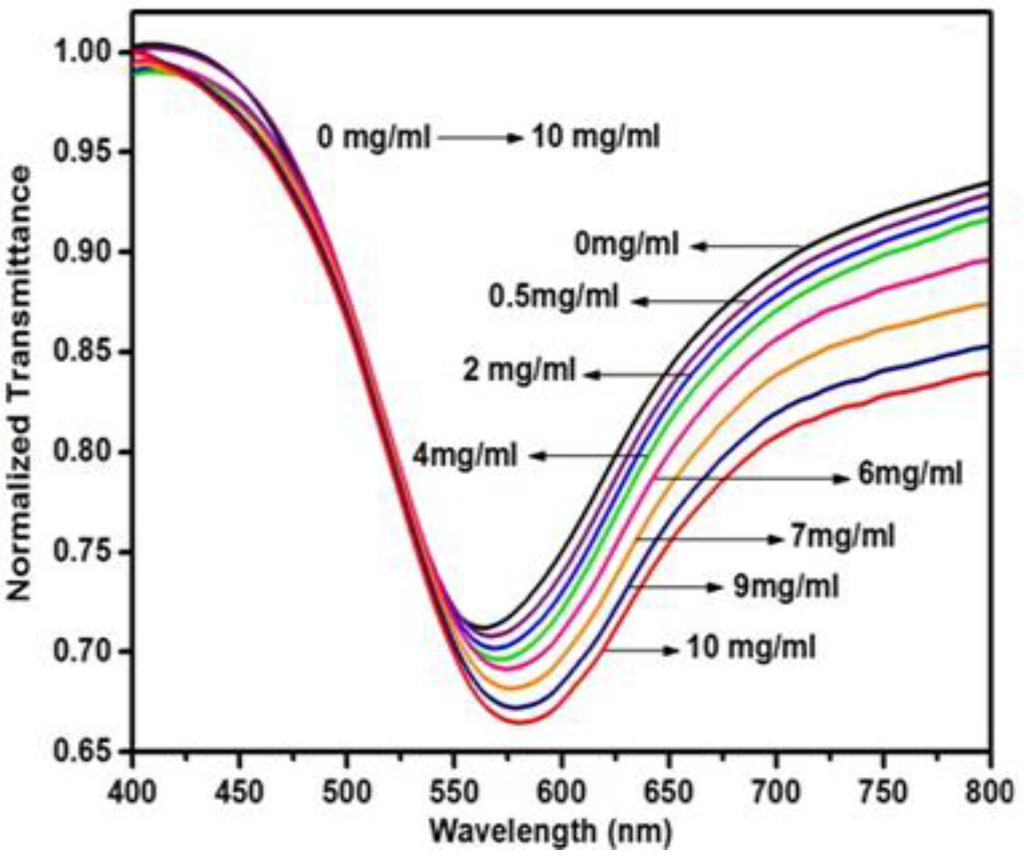 The operating range of the sensor was enhanced to 0–10 µM in this work. The shift in peak absorbance wavelength was found to be around 102 nm for the same TC concentration range and shown in Figure 11. The sensing method showed a detection limit of 2.2 × 10−9 M for TC.