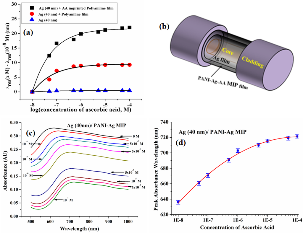 - Shrivastav, A.M.; Mishra, S.K.; Gupta, B.D. Surface plasmon resonance based fiber optic sensor for the detection of ascorbic acid utilizing molecular imprinted polyaniline film. Plasmonics 2015, 10, 1853–1861. [Google Scholar] [CrossRef]