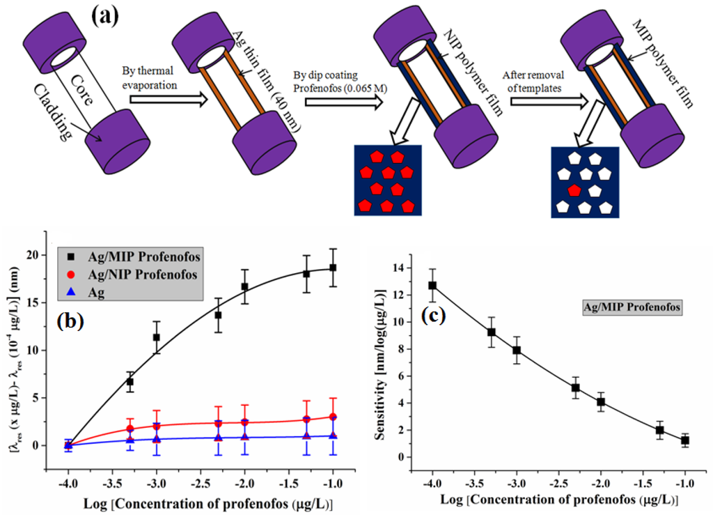 Both ends of the fabricated probe are cleaved using a sharp stainless steel blade for the launching of maximum light into the fiber. The probe is fixed in a flow cell with the facilities of inserting and removal of the sample solutions. This is to ensure the interaction of sample solution with the MIP layer/sensing medium. The setup is then mounted on a three-dimensional translational stage to ensure that the maximum light could be guided through the fiber. The light from a polychromatic source is launched through one end of the fiber. This may be referred to as the input end. The light interacts with the sensing medium and changes its characteristics (due to the analyte interaction in MIP layer) which are recorded as the transmitted response at the other end of the fiber using spectrometer which is interfaced with a computer/laptop. In the case of metal nanostructures, usually absorbance is recorded instead of transmittance because of absorption of light by metal nanoparticles. The wavelength corresponding to the resonance condition is called peak absorbance wavelength. In the following section, various sensors reported in the literature for the detection of analytes having applications in environmental monitoring, food/water safety, agricultural production, drug/vitamins detection, etc. are discussed.