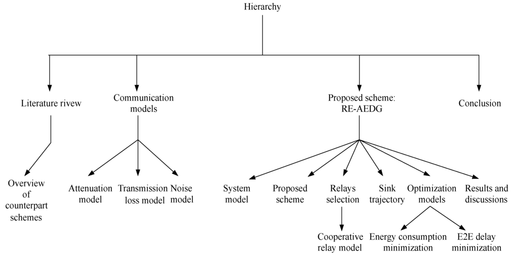 The rest of the paper is organized as follows. Section 2 describes related work; overview of counterpart schemes is given in Section 3; Section 4 presents underwater acoustic communication models; Section 5 presents system model; Section 6 discusses the proposed scheme; Section 7 deals with possible relay selection; Section 8 describes AUV trajectory and Section 9 defines the optimization models for the proposed scheme; Section 10 elaborates the applications of the proposed model; In Section 11, performance efficiency of the proposed scheme is validated via simulations. The hierarchy of paper is also presented in Figure 1.
