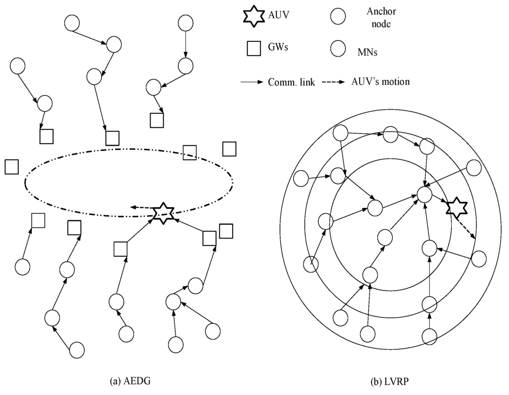 Whereas in AEDG, heterogeneous nodes are deployed in vicinity of a predefined elliptical AUV trajectory, nearer nodes are GWs and the farther ones are MNs. GWs gather data from MNs and hold it until AUV approaches them. Deployment of GWs reduces the control packet overhead as lesser number of nodes track the recent AUV locality. MNs form a chain among themselves with a GW node as chain head. Moreover, number of nodes connected in a chain is also restricted to avoid longer intercommunication distances. Conservation of energy is the distinguishing factor of AEDG. Thus the design objective of our proposed technique is the effective utilization of that conserved energy to intensify network’s operational efficiency in terms of network lifetime and throughput rate. Pictorial view of AEDG and LVRP with single AUV is shown in Figure 2.