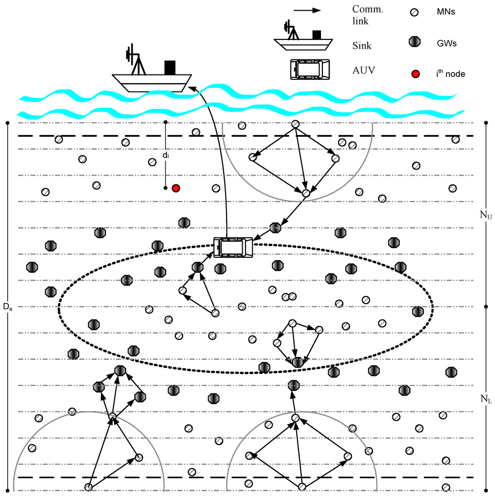 Figure 3 shows that nodes are randomly deployed in the network field. Depending upon the features that are represented in Table 2, we categorize the network nodes into member nodes (MNs), gateway nodes (GNs) and autonomous underwater vehicle (AUV). In this work, the following assumptions are made: