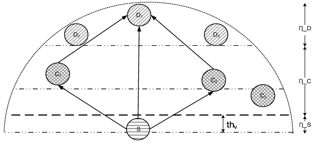 For convenient data transmission process and energy conservation, transmission range of the source node is divided into three slices such that the first slice contains source node itself and possible cooperating nodes , the second slice also contains possible cooperating nodes (see Figure 4 whereas, the third slice contains only.