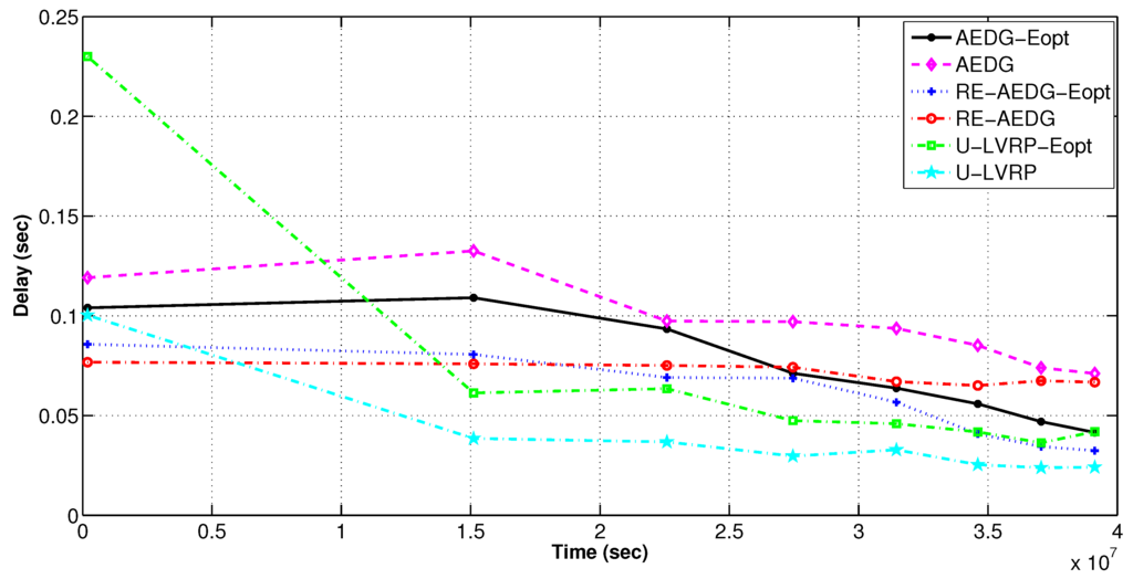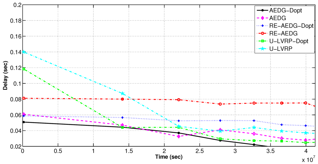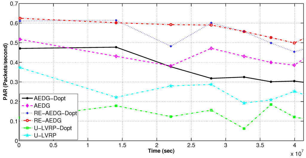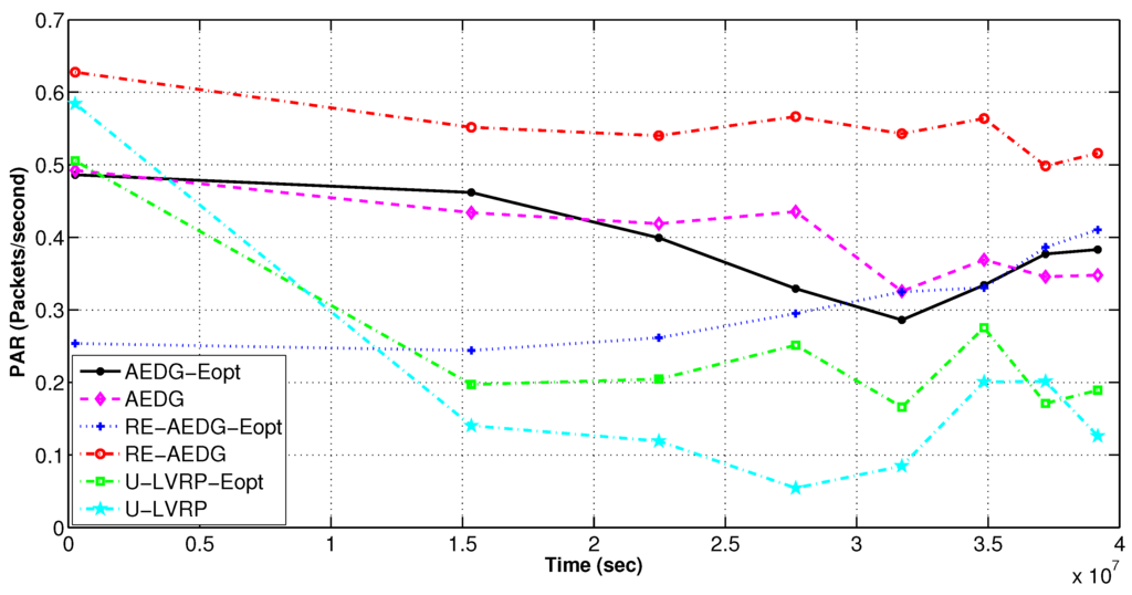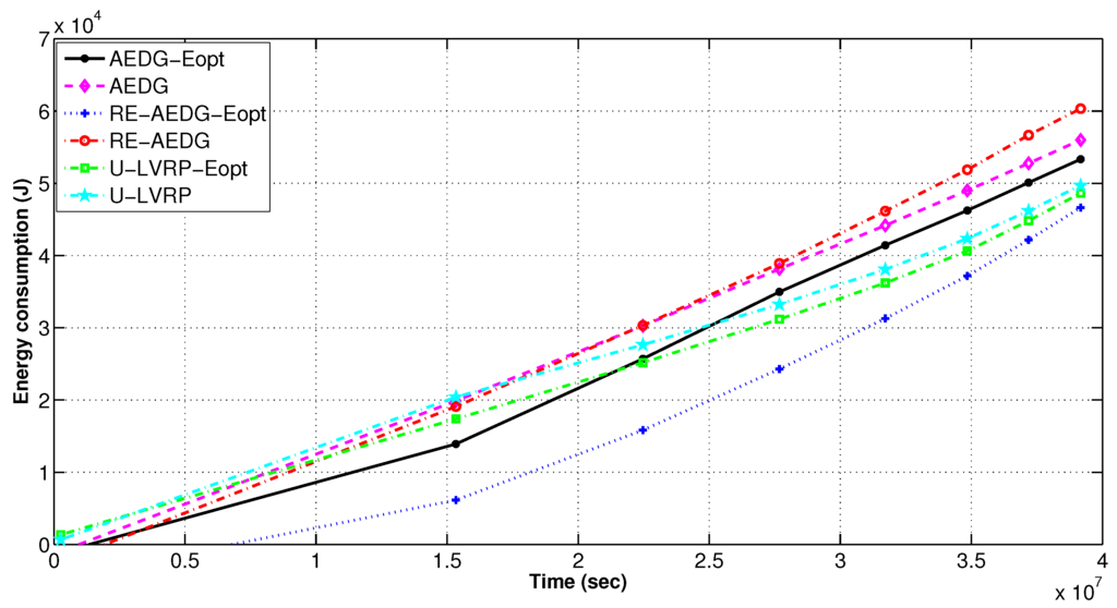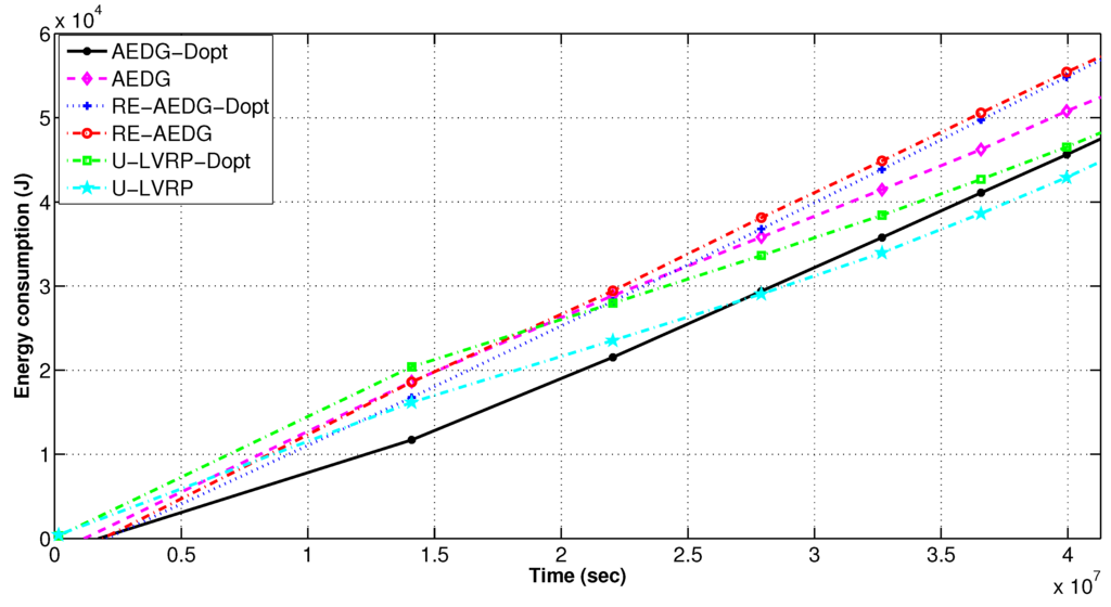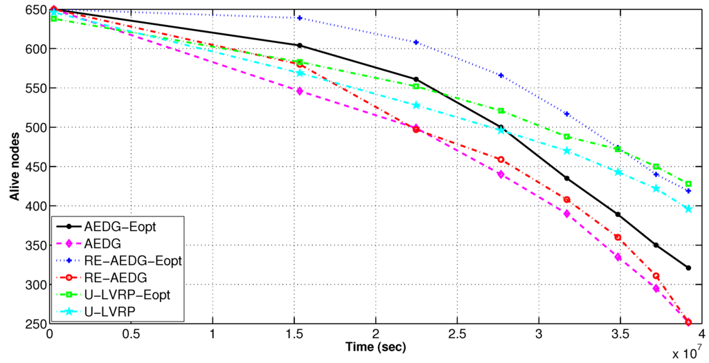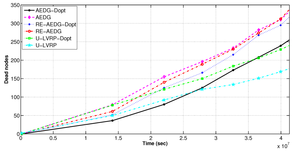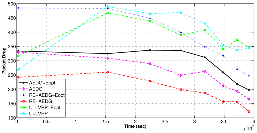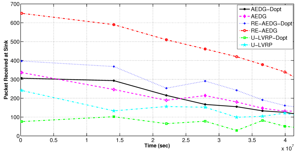 AEDG and LVRP are chosen for comparison because of their conceptual relevancy with RE-AEDG. In LVRP a model is designed which considers multiple mobile sinks following unconstrained sink trajectories. In the data transmission process control packets are generated in order to track the recent sojourn stop of sink. In LVRP, the major objective is to minimize the packet overhead, caused due to the flow of these control packets. Therefore, at LVRP the packet overload is reduced through proper linking of an anchor node to the sink. Anchor node gathers the data on the behalf of sink and the sink issues new routing updates only when it switches its sojourn stop and no more remains in its transmission range. It is selected through proper election from the nearest member nodes, moreover; it is a casual node and is responsible for making a connection between nodes and sink.