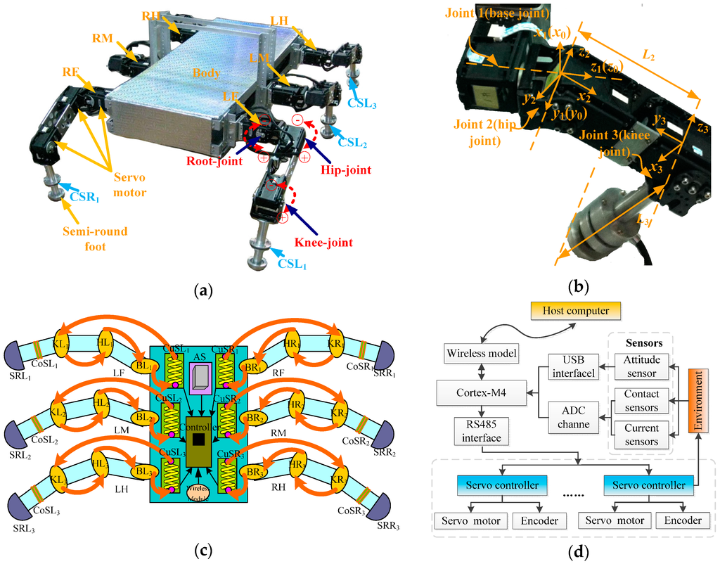 The sensors, especially the camera, attitude sensor, and force sensor, play an important role in the intelligent robotics field [31,32]. The distribution of the multi-sensor system of the robot for observing motion state is shown in Figure 1c. BLi, HLi, and KLi (BRi, HRi, and KRi for the ith leg) respectively represent the base-joint, hip-joint, and knee-joint on each left (right) leg, and LF, LM, and LH (RF, RM, and RH) respectively represent the front leg, middle leg, and hind leg on the left (right) side. Each joint is composed of a DC motor, a high reduction rate gear system, and has an integrated encoder, which is used for detecting the position of the joint angle. Contact sensors (CoSLi or CoSRi) installed on the semi-round foot tips (SRLi or SRRi) are used for monitoring the gait of the robot. In order to reflect the energy consumption of each leg in different gaits, current detection modules (CuSLi or CuSRi) are used. The arrows represent current flow direction. The attitude sensor (AS) is installed in the body to monitor the posture of the robot body. And then, the data processed by the wireless module transmits to a host computer to generate commands. Finally, the commands are send to the slave board Cortex-M4 to control the motion of each leg and to monitor the state of each sensor. The diagram of the control architecture is shown in Figure 1d.