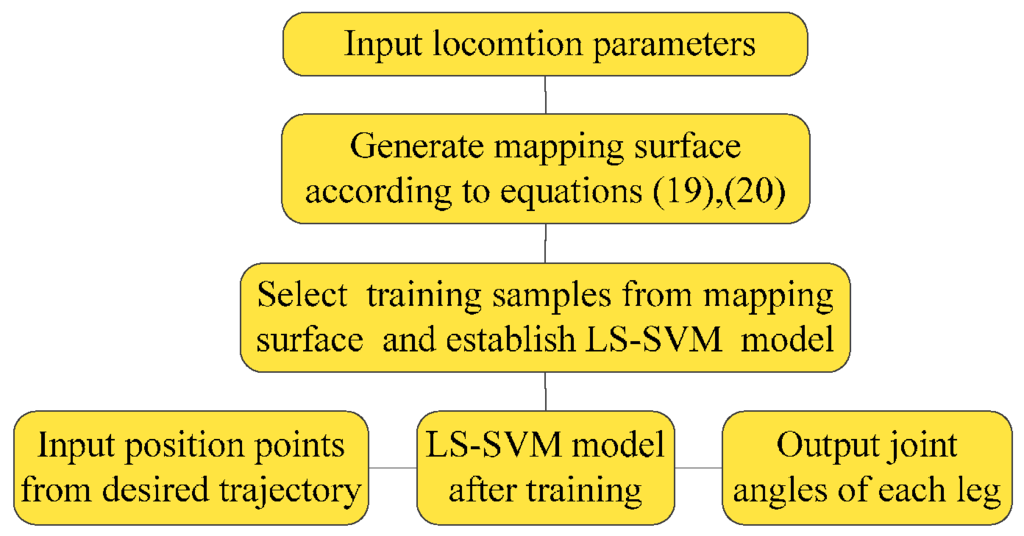 In order to solve this nonlinear mapping problem, LS-SVM is utilized to approximate the mapping in this section. In other words, this nonlinear mapping between the ideal location of the foot and the joint angle ( is approached by constructing the optimal linear regression function, and then the inverse kinematic solution is found.