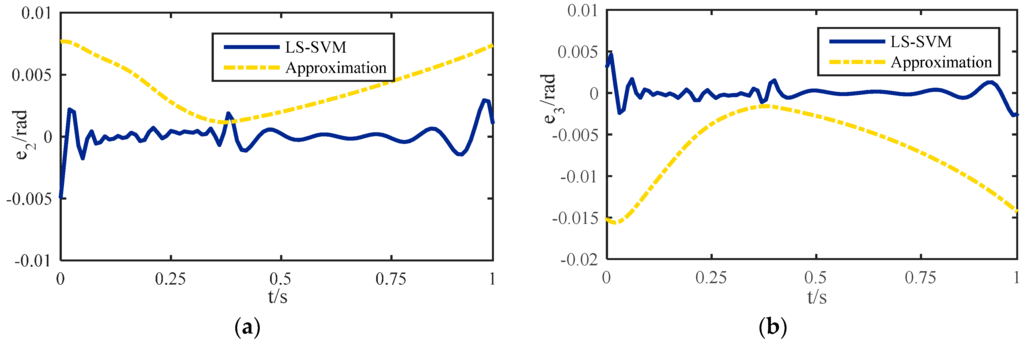 Joint angle errors of LS-LSM and the approximation method: (a) The angle error of the hip joint; (b) The angle error of the knee joint.