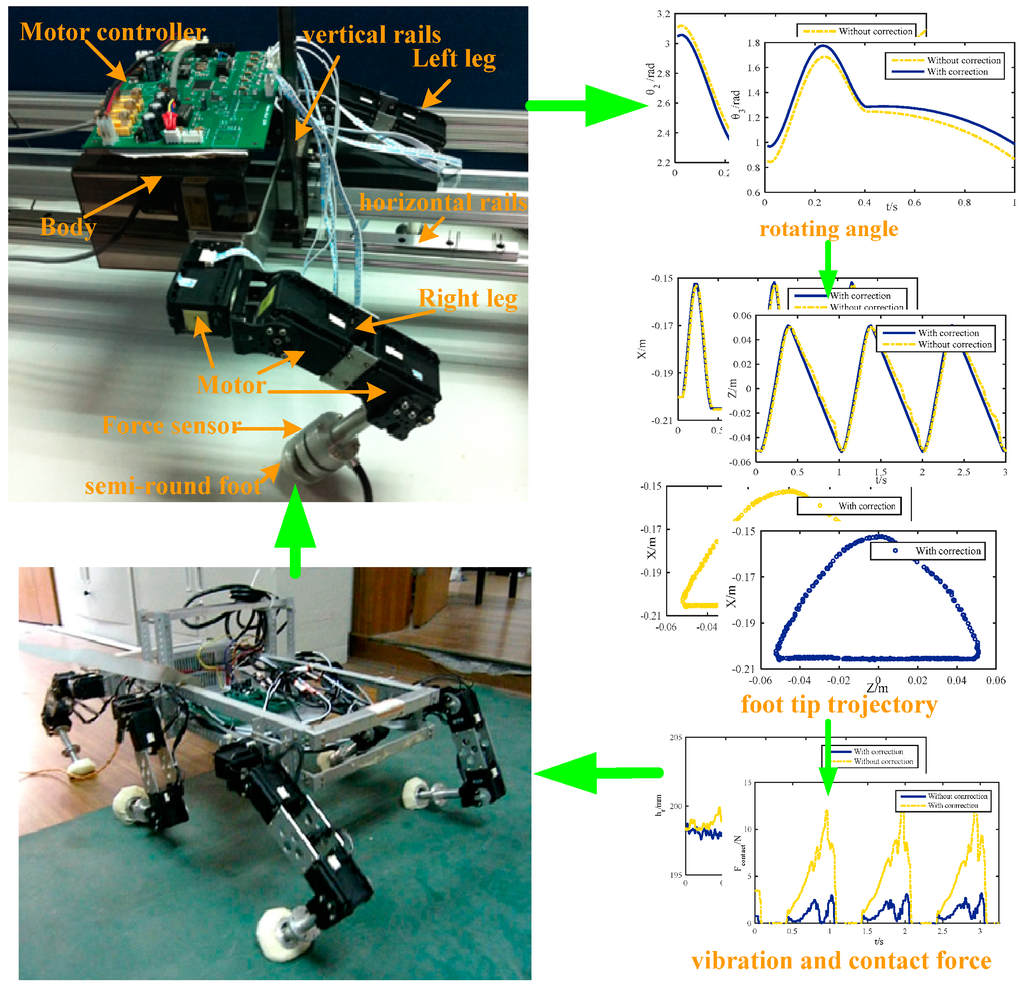 The main body of the platform is supported with two legs in a mammal-like configuration, similar to the mentioned hexapod in Figure 1. Each leg consists of three linkages which are connected by a hip joint and a knee joint. The leg mechanism is attached to the body via a base joint. Since the platform is designed for locomotion tests, it is equipped with horizontal and vertical rails with corresponding displacement sensors, a five-axial force sensor, and LPC2368 based motor controllers. During the experiment of a single leg, the left leg is fixed on the supporting platform. Thus, the forward direction Z remains stationary, the X direction is free, and its displacement can be obtained by the vertical displacement sensor. The right leg moves in the desired trajectory periodically. The joint angle curves obtained by the proposed correction methodology and traditional method are used for the foot trajectory test, base-joint vibration test, and contact force test, as shown in the leg platform test diagram in Figure 7. According to the test results above, the performance of the methodology is observed. The gait parameters used in the experiments are as follows: the leg lift height is h = 0.05 m, the coefficient of land is β = 0.6, the step cycle is T = 1 s, the step size is S = 0.1 m, the body height is H = 0.2 m, and the radius of the semi-round rigid foot is R = 0.02 m.