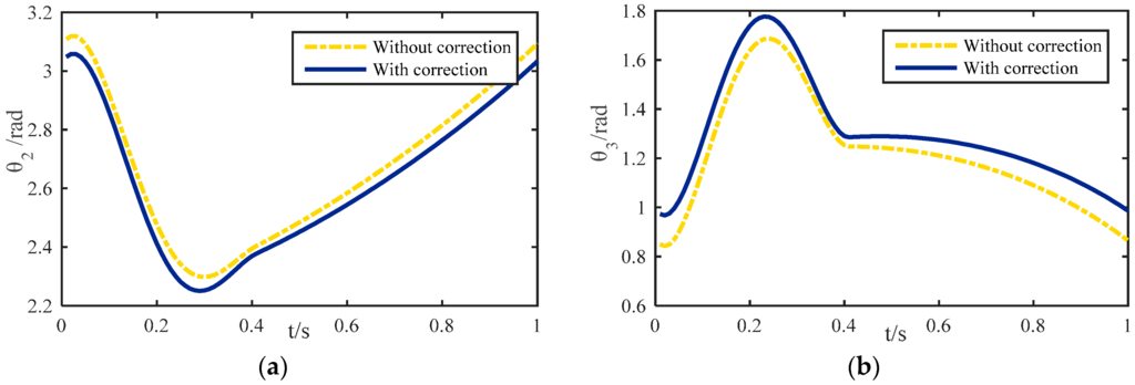 Substituting Equation (17) into Equation (2), the modified joint angles and can be obtained. However, it is difficult to solve because Λx, Λy, and all have a relationship with and . Here, it is approximately solved by using uncorrected joint angles.