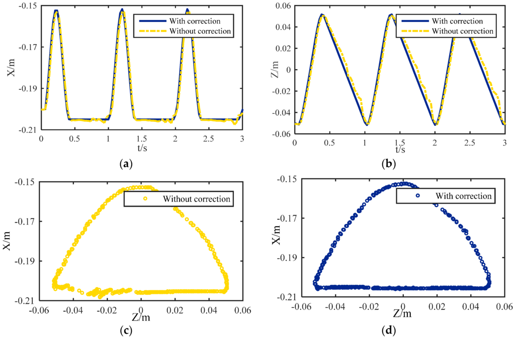 The trajectories of the foot tip relative to the base-joint are tested, which is shown in Figure 9. The supporting phase and the swing phase appear alternately and periodically. The gait cycle time is 1 s, and the leg is in swing state from 0 to 0.4 s. For the first half of that time period the leg is in lift-off phase, and in the second half it is in flight phase. The maximum lift height of the leg is 0.05 m as designed. From 0.4 s to 1 s, the robot is in the supporting phase. The displacement in the X direction is shown in Figure 9a. When the leg is in this state, the distance between the lowest point of the foot tip and the base-joint is larger than 0.2 m slightly. The trajectory in the X direction is not a smooth straight line, but has some fluctuation. That is because the actual contact point is not the design point. Thus, the robot will vibrate up and down during walking. However, with correction the trajectory becomes a smooth straight line. In the Z direction, the problem is the same as in the X direction, which is shown in Figure 9b. With correction, the smoothness of the trajectory is notably improved. The synthesized trajectory curves in Figure 9c,d are obtained by compounding the displacement of the X direction and the Z direction. The upper part of the curve represents the swing phase, and the lower part indicates the supporting phase. The unsmooth contact will make an impact on the ground and increase the contact force. Moreover, the imbalance body posture will cause slipping of other legs. With correction, the contact trajectory is a smooth straight line. The centroid of the robotic body will be kept constant during movement, so the robot will be more stable during walking.