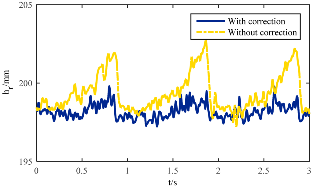 The base-joint is connected with the body rigidly, and the trajectory of the centroid of the robot is determined by the trajectory of the base-joint. The vibration of the base-joint will affect the motion of the robotic centroid directly. If the vibration is large, the energy consumption of the robot will be increased and the stability will be greatly reduced. According to the experiments above, the corrected trajectory of the base-joint in the X direction and the un-correction trajectory are tested, which are shown in Figure 10. The ideal base joint trajectory according to the method above should be a straight line, since the robot should go forward along the Z-axis with constant speed and no displacement in the X direction. It can be concluded from Figure 10 that the trajectory without correction has apparent vibration in the X direction and the value of the deviation is nearly 5 mm at the time points 0.9 s, 1.8 s, and 2.7 s. That means the robot will suffer periodic shocks while moving. However, after correction, the base-joint trajectory is almost kept level, the vibration is small, and the stability is improved. This result is not only related to the radius of the semi-round foot but also to the angle between the end-linkage and the ground generated by the foot trajectory planning. In the second half of the support phase, as the angle between the end-linkage and the ground increases, the distance of the actual contact point and the ideal contact point becomes farther. This makes the base-joint more shock upwards obviously. The trajectory correction methodology proposed can be used for effectively modifying the trajectory of the base-joint.