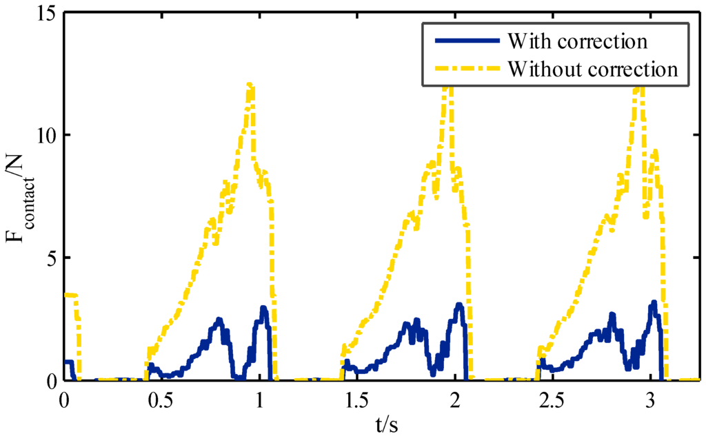 During the movement of the hexapod robot, the foot mechanics play a very important role [39]. On unstructured terrain, the robot can adapt to complex conditions by changing its posture, and the gait generation strategy of the robot according to the foot tip contact force. The study of foot mechanics is beneficial to optimize the gait planning, enhance the stability, and reduce the energy consumption of the robot during locomotion [40]. In the single leg experiment shown in Figure 7, the ideal state is that in which the contact between the foot and the ground is kept in a critical state. However, if there is a deviation between the real trajectory and the desired trajectory, it will lead to interaction with the ground, causing a bigger contact force or even impact, which is the reason for vibrations. If the foot trajectory is designed in a better way, the force will be smaller and with no sudden changes, which demonstrates that the contact stability is enhanced. If there is no force, it means no contact and it is unreasonable as well. The forces with correction and without correction are all tested in experiments, which are shown in Figure 11. It illustrates that the foot starts touching the ground at 0.4 s and the contact force without correction becomes larger, which corresponds with the trajectory deviation. At time points 0.9 s, 1.8 s, and 2.7 s, the force reaches a maximum of 13 N, but with correction, the trajectory deviation becomes smaller. Meanwhile, the contact force is also very small, reduced by 70% compared with the uncorrected force, and less than 4 N, which can be considered as a critical contact with the ground. That means that the modification of the trajectory by the suggested methodology can reduce the influence on the contact force effectively. This has great significance for the further control of the foot force and stability [41].
