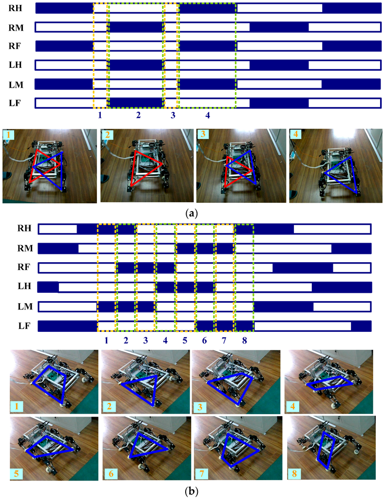 Diagram and snapshots of different gaits: (a) Tripod gait; (b) Improved wave gait.