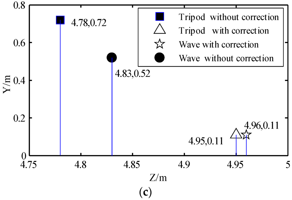 Because of the terrain or slippage of certain legs, the robot will appear to deviate from its direction during movement. In this part, the experiments are carried out on smooth ground, as shown in Figure 12. Thus, the influence of the ground can be excluded. In order to verify the effect of the correction methodology on the deviation, the deviation in the Y and Z directions with and without correction are compared. The deviations of the two gaits with the two methods in the Y-direction are shown in Figure 13a. In the diagram, for the tripod gait without correction, the minimum deviation distance is 0.52 m, the maximum is 0.92 m, and the mean value after 10 tests is 0.72 m. Similarly, for improved wave gait without correction, the values of deviation are slightly smaller, because it has more legs supporting it than with the tripod gait. However, for the gaits with correction, the minimum deviation distance is 0.02 m, the maximum deviation distance is 0.21 m, and the mean value is 0.11 m. The slippingage was very serious and obvious for some feet while walking, when the joint trajectory without correction was used. It caused the robot to deviate from the desired direction and trajectory. After using the correction methodology, the deviation distances of the tripod gait and improved wave gait are reduced on average by 84% and 78%, respectively. The progress in the Z-direction is shown in Figure 13b. The progresses of both gaits with correction are all slightly larger than before. Since the foot slippage is reduced, larger friction is obtained and the locomotion of the robot is dramatically improved. The position deviations under the two methods are shown in Figure 13c.