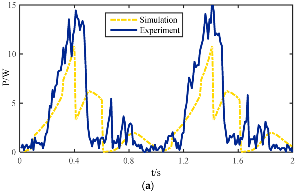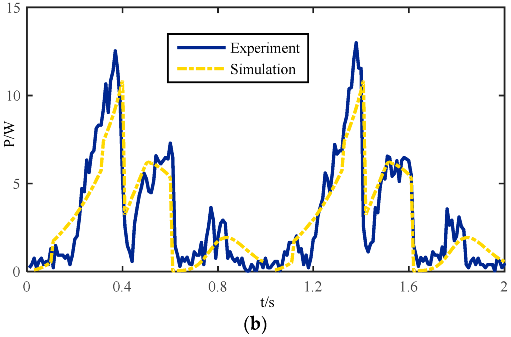 The energetic cost curves of a single leg in improved wave gait with two methods are shown in Figure 14. The dashed line represents the optimized theoretical value. The solid line in Figure 14a represents the energy consumption of a single leg under control of the kinematic algorithm without taking foot shape into consideration. The solid line in Figure 14b represents the energy consumption by using a semi-round rigid foot correction methodology. As can be seen from the graph, without the use of the modified algorithm, the maximum value of the actual power exceeds 15 W, while the theoretical maximum value is 12 W. However, with the correction methodology, the actual maximum power is 13 W, which is very close to the theoretical value. The trend of the curve is more consistent with the theoretical value. That is because the slippage of the legs at some times will affect the trend of energy consumption. On the other hand, the slippage will also lead to redistribution of the contact force and moment of the leg, and eventually affect the energy consumption results of the whole system, so taking the foot shape into consideration during the trajectory planning has great significance for stability.