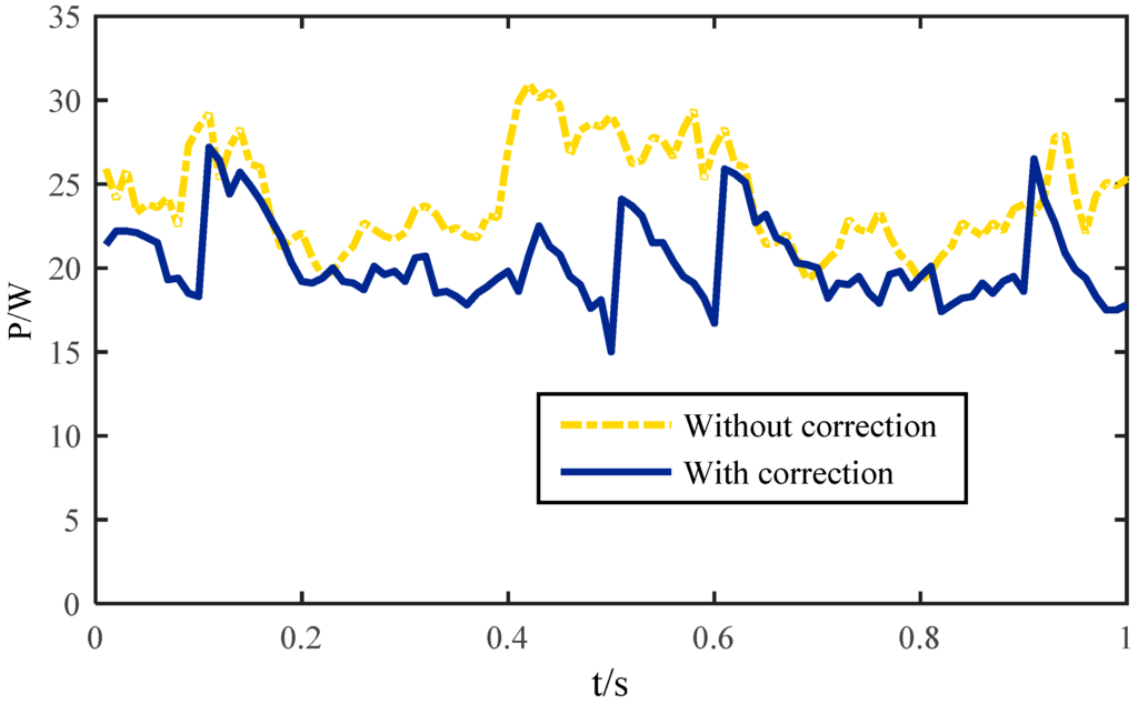 A comparison of system energy consumption between the correction methodology (dashed line) and un-correction (solid line) in one gait cycle time is shown in Figure 15. It is obvious that the maximum power is 31 W without correction and 27.5 W with correction. The average value of the energy consumption goes from 25 W to 20 W. That means about 20% of the energy can be saved during walking, so the correction methodology not only avoids the force impact caused by sliding of the supporting legs, but also reduces unnecessary energy consumption caused by interference of each leg with the semi-round foot.