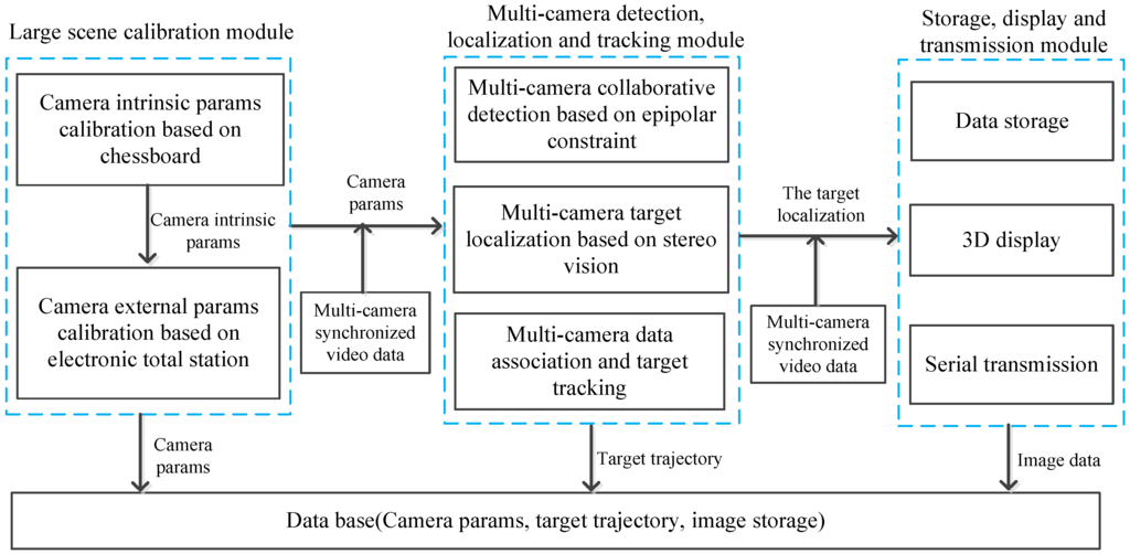 To get high localization accuracy, precise camera parameters are needed. Classical camera calibration methods include Weng’s [33], Zhang’s [34], etc. For those traditional camera calibration methods, the reference points or lines must be distributed in space or in the calibration image rationally, which is easy to be constructed indoors or if the view field is not large. To obtain the precise camera parameters in large scale outdoors, a new camera array calibration method is presented.