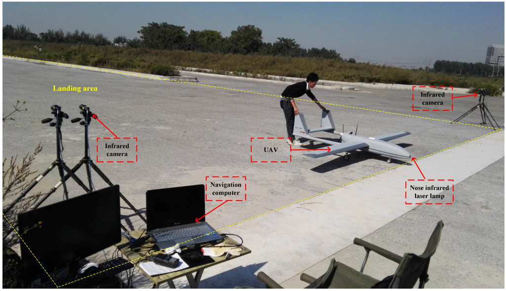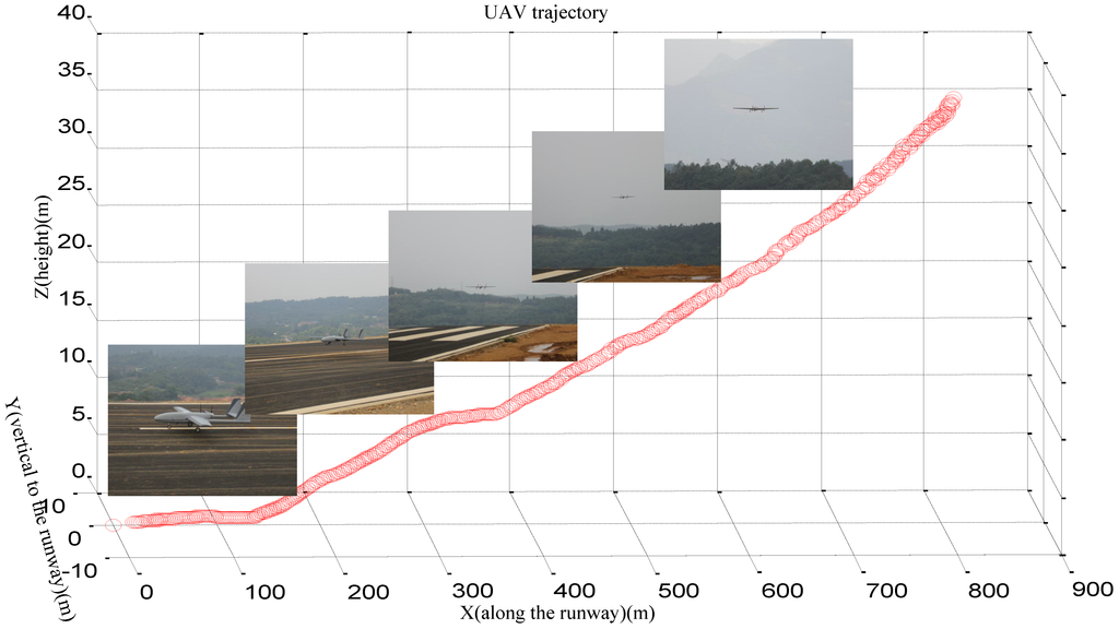 We have performed extensive automatic landing experiments in several places successfully. In order to enlarge the field of view, we usually choose the runway whose width is more than 15 m. The field of view is usually determined by the width and length of the runway. As described previously, the two infrared cameras are located on the two sides of the runway respectively to capture flying aircraft images. One of basic principles is that the public field of view should cover the landing area of the UAV. In the actual experiment, the landing area is usually already known, thus it is easy to make the infrared camera array cover the landing area. And to ensure the accuracy, the imaging of the landing area should be close to the image center, especially for the last 200 m. The detection range changes with the baseline. With the baseline of 20 m, the minimum detection range is about 25 m and the maximum detection range is over 1000 m. The UAV takes off and cruise at an altitude of 200 m using the DGPS system. Once the UAV is detected and the error is acceptable, the UAV is guided to land by our ground-based vision system.