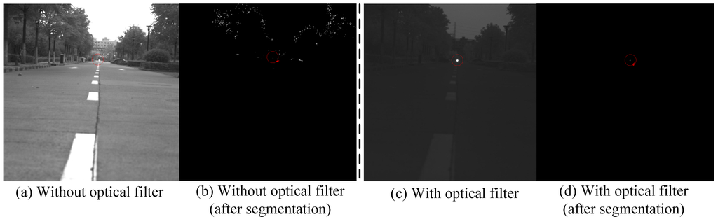 In order to increase the anti-interference ability of the optical imaging module, a kind of Near-IR interference bandpass filter is adopted. The wavelength of the optical filter is 808 nm, of which the signal attenuation is small. The filter is fixed in front of the camera lens, so the camera is only sensitive to the wavelength of 808 nm. The emission wavelength of the near infrared laser lamp fixed on the UAV is 808 nm. The filter is a component of the infrared camera array. The cooperation of the infrared camera array and the light source could guarantee distinct imaging of the near infrared laser lamp and effectively avoid interferences of complicated background. Thus the robustness and the detection range of the system are both greatly improved. As shown in Figure 4, we can see that the filter could get rid of almost every interferential signal successfully. The optical filter parameters are shown in Table 4.