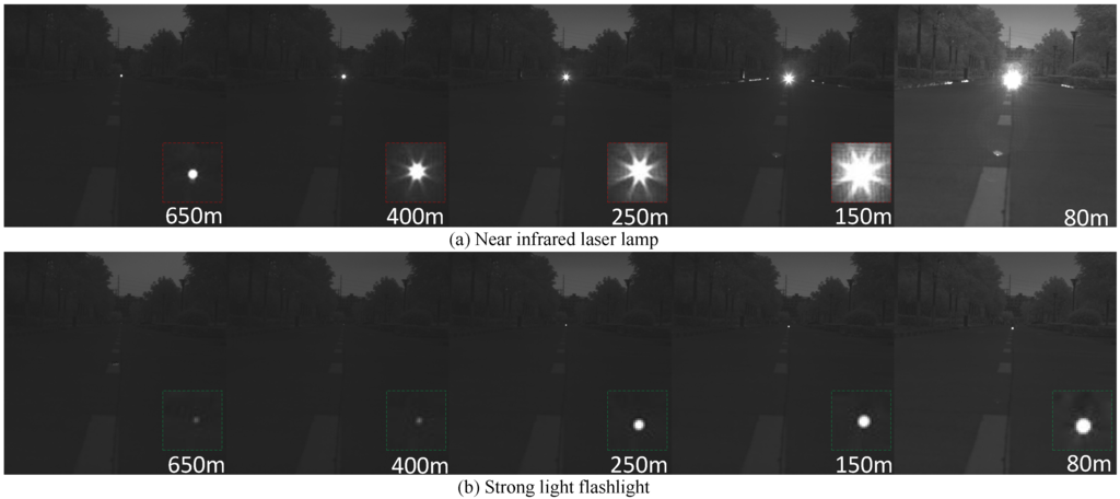 We have compared several different kinds of light sources such as strong light flashlight, high intensity discharge lamp, halogen lamp, etc. Because of those light sources are sensitive to visible light and have a short irradiation range, we finally choose the near infrared laser lamp. In this section, we will present the comparison results of near infrared laser lamp and strong light flashlight.
