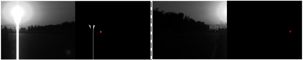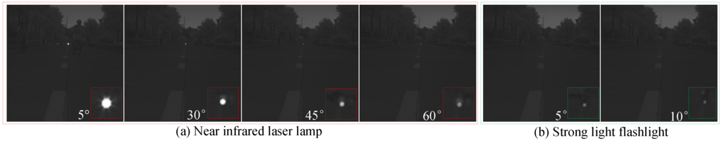 The system need to have a certain fault tolerance to the angle change. In this experiment, we place the light sources at the same position with the same directions firstly, and then adjust the horizontal rotation angle of the light source. We did this experiment at 150 m. As shown in Figure 6, the near infrared laser lamp can be detected robustly from 0 degrees to 45 degrees, while the strong light flashlight cannot be seen clearly when the angle is greater than 10 degrees.