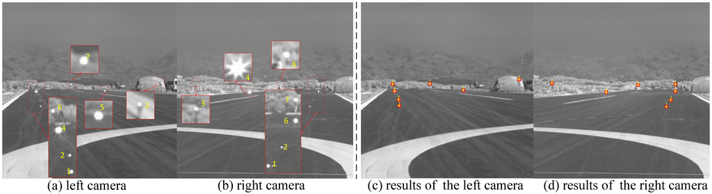 A practical experiment based on control points has also been conducted to verify the calibration results as shown in Figure 7. The calibration images taken by the two infrared cameras are shown in Figure 7a,b. As described previously, the positions of the control points are measured by electronic total station. The red circles in Figure 7c,d are real positions of the control points, which are marked by our detection algorithm. The world coordinates of control points are re-projected to the image coordinates based on calibration parameters, which are marked by yellow crosses as shown in Figure 7c,d. We can see that the red circles and yellow crosses are basic coincidence, which demonstrate the calibration accuracy of the intrinsic and external parameters effectively.