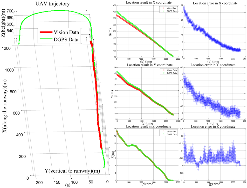 Comparison of DGPS and vision data. (a) The UAV trajectories of vision-based method and DGPS method; (b–d) The location results in X, Y and Z coordinates. (e–g) The location errors in X, Y and Z coordinates.