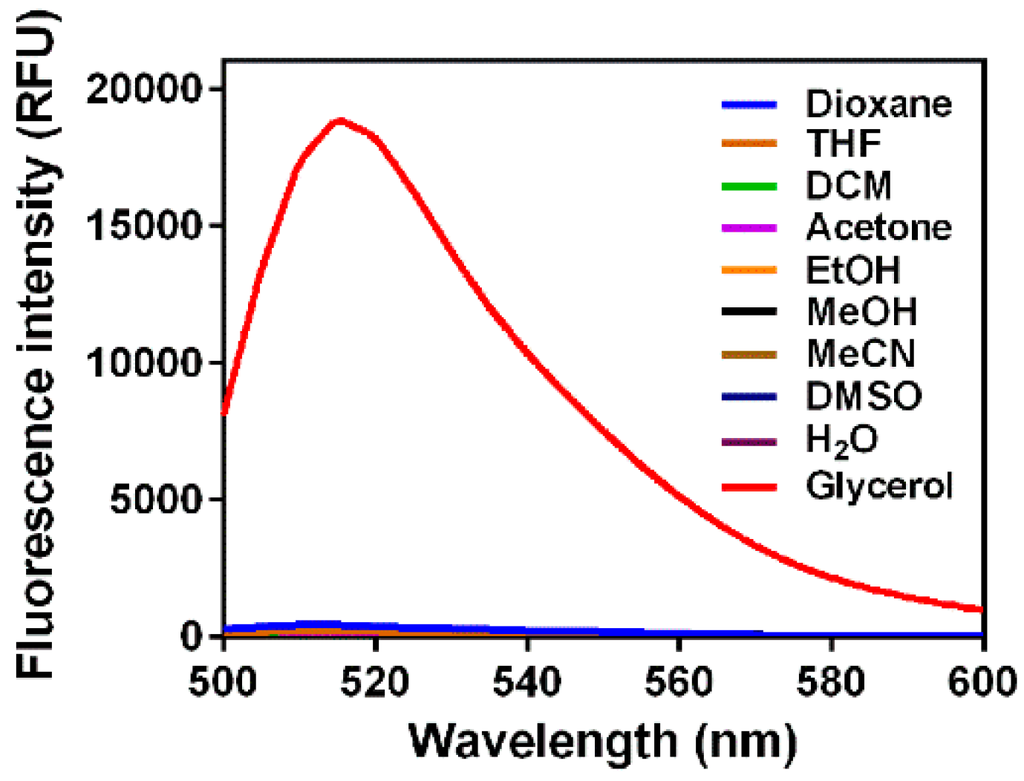 The solvent dependency of BTV has been studied by measuring the spectroscopic properties of BTV in various solvents with distinct viscosity properties. The maximum absorption and emission bands of BTV did not display significant changes. In contrast, the fluorescence intensity of BTV in glycerol was obviously larger than that in other organic solvents. The quantum yields of BTV in different solvents have been summarized in Table S1, which showed that the quantum yields were less than 0.1 in low-viscosity media, whereas in high-viscosity solvent, such as glycerol, the quantum yield increased to 0.56 (Figure 1). Based on our previous observation, the increased quantum yield of BTV in high-viscosity solvent was a result of the restricted intramolecular rotation of the phenyl rings around the axes of the single bond linked to the BODIPY core [,]. In the presence of highly viscous solvent, the absorbed energy was dissipated predominantly through the radiative emission channel rather than lost through rotational energy relaxation. On the other hand, the relationship between the solvent polarity and the fluorescence intensity of BTV was also investigated. It was found that the fluorescence intensity was not affected by the solvent polarity, which makes it beyond the influence of environmental conditions (Table S1).