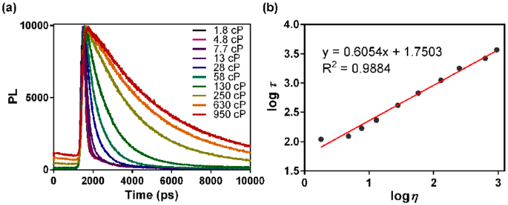 Viscosity-dependent fluorescence lifetime of BTV in solvent mixtures. (a) Changes of fluorescence lifetime of BTV (10 μM, λex = 430 nm, 25 °C) with the variation of solution viscosity (methanol-glycerol system); (b) The linear response between log τ and log η.