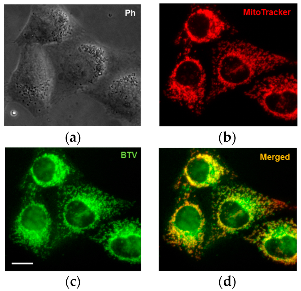 HeLa cells were cultured in high-glucose (4500 mg/L) containing-Dulbecco’s Modified eagle’s medium (DMEM) supplemented with 10% fetal bovine serum, 100 U/mL penicillin and 100 µg/mL streptomycin. Then 24–36 h prior to imaging, cells was seeded in clear bottom, 96-well plate. BTV was added to cultured cells to reach final concentration of 1 µM and incubated for 30 min at 37 °C and subsequently washed twice with PBS buffer before imaging. For mitochondria co-localization study, 0.5 µM MitoTracker Deep Red (Life Technologies, Waltham, MA, USA) was incubated together with BTV. To induce mitochondria swelling, cells were pre-treated with 10 µM monensin for 30 min at 37 °C before BTV staining. Live cell images were acquired on an inverted Ti-E microscope (Nikon Instruments Inc., Tokyo, Japan), equipped with FITC filter for BTV fluorescence acquisition, as well as Cy5 for MitoTracker DeepRed fluorescence acquisition. Images were analysed using NIS Elements 3.10 software.