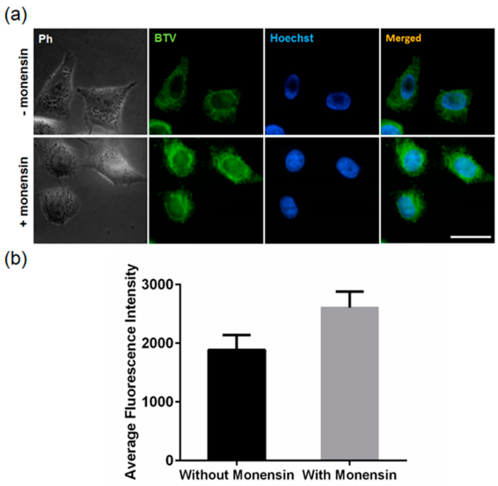 (a) Fluorescence intensity measurement of BTV-treated (1 μM) HeLa cells before and after incubation with 10 μM monensin for 30 min. Images were taken with a 40× objective. Scale bar represents 50 μm; (b) Fluorescence intensities were displayed as averages of measurements from twelve sites taken across three wells. * p < 0.005.