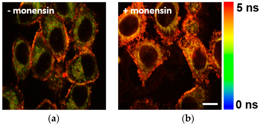 Fluorescence lifetime images of BTV-treated (1 μM) HeLa cells (a) Before and (b) After incubation with 10 μM monensin for 30 min. Scale bare represents 20 μm.