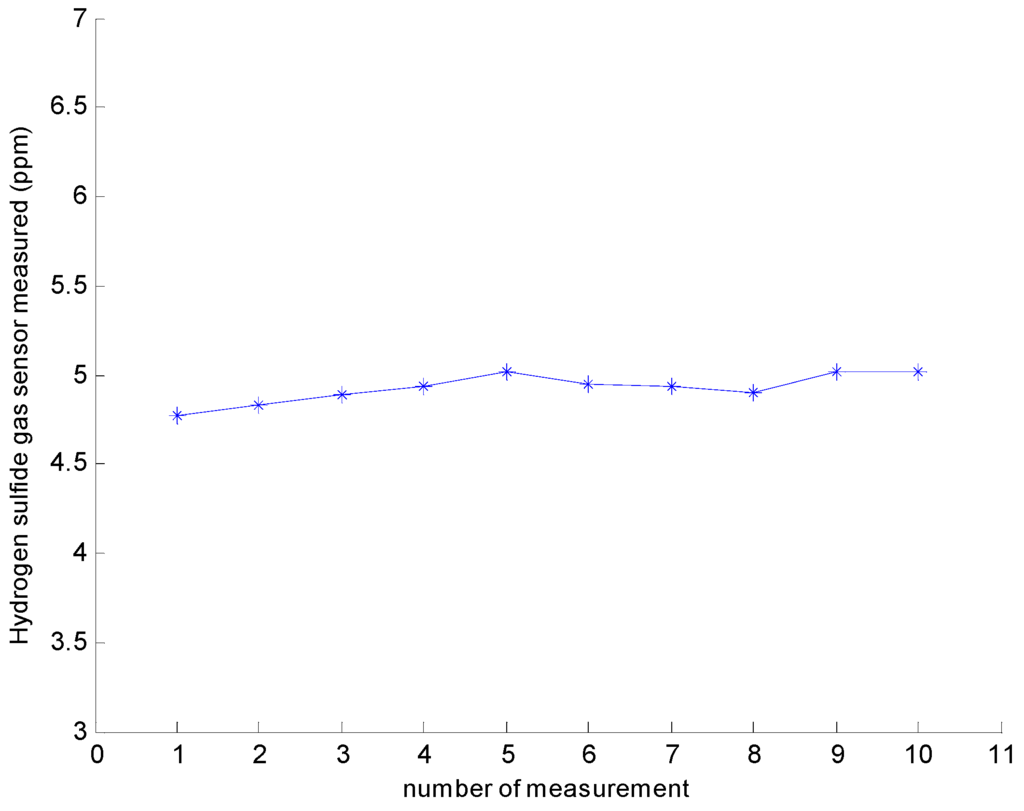 The gas sensor repeatability test was performed 10 times with an H2S gas concentration of 5 ppm. The results are shown in Figure 4. From the test results, we observe that the sensor output fluctuated within 5 ppm. The relative standard deviation (RSD) was 1.67%. The smaller RSD implies that the determination results were more concentrated, and the precision was better. The results show that the sensor has high repeatability.