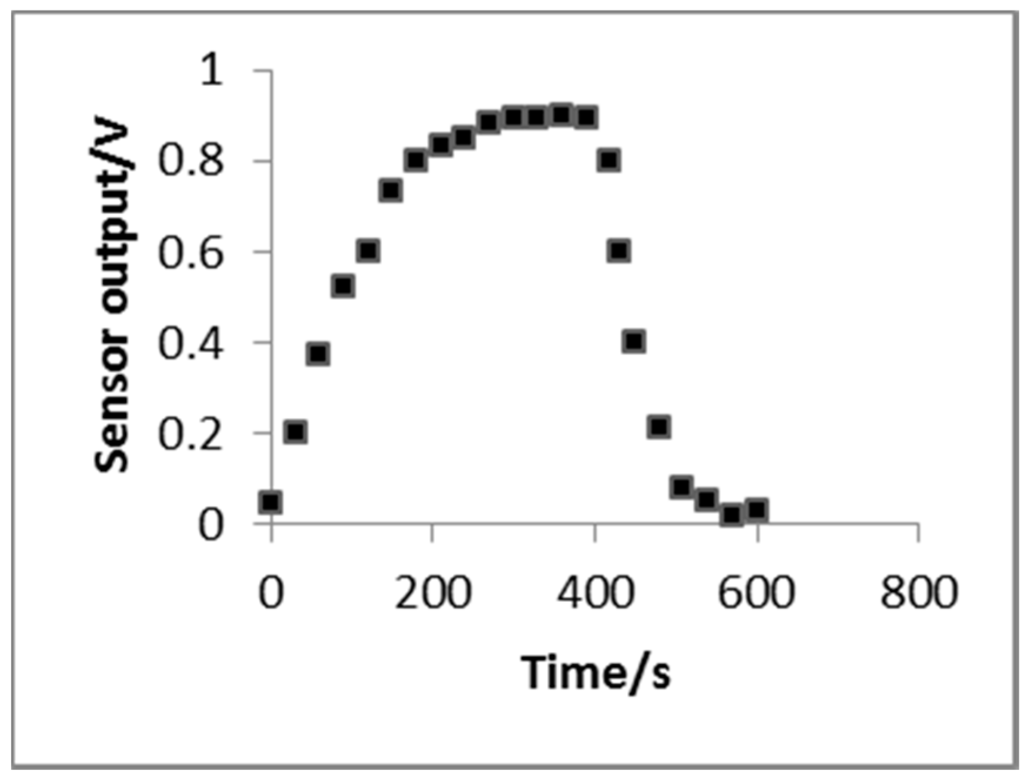 The response time-to-recovery test of the H2S gas sensor used a dedicated dynamic test system. The sensor output accessed the data capture card of the PC, and the gas density using a 5-ppm volume fraction. The results are shown in Figure 5. The test results show that when the H2S gas sensor experiences a 0.9 V output, the recovery time is approximately 1 min. The response time and recovery time were longer than those of commercial H2S sensors. However, the H2S concentration in chicken coops always slowly changes, and the response time-to-recovery can satisfy the monitoring requirement.