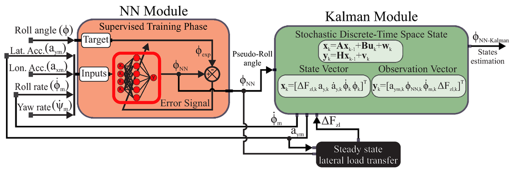 The Kalman module employs a discrete stochastic state-space form. The purpose of this module is to estimate the internal state of a linear dynamic system by means of a Kalman filter. The Kalman filter is a mathematical tool that is used for stochastic estimation from noisy sensor measurements. The real vehicle measurements include a substantial quantity of noise, as well as unobserved states in the system, which must be estimated. In this research, the unobserved state is the roll angle. The preliminary reconstruction of the roll angle obtained from the NN-based observer is used as a “pseudo-measurement” input to the Kalman filter. This previous calculation presents the advantage of considering the system non-linearities, thus providing good estimations, even though a linear vehicle model, represented as a state-space model, is used.