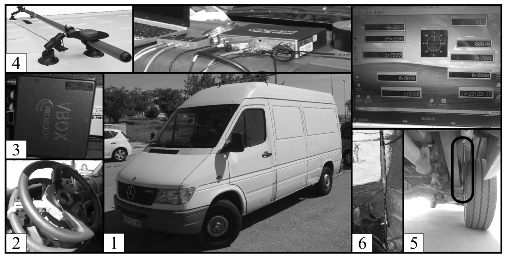Experimental setup on a test vehicle. (1) Mercedes Sprinter. (2) Steering angle sensor MSW 250 Nm. (3) Vbox 3i dual antenna data logger. (4) GPS antennas. (5) LVDT MNT potentiometer. (6) SA-LP075 potentiometer.