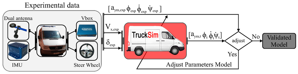 The TruckSim simulation vehicle model was validated using experimental results from the real vehicle. TruckSim software [23] is a widely-used simulation software in the automotive industry that combines traditional and modern multi-body vehicle dynamics based on parametric modeling. One of the main advantages of using a simulated vehicle model is the ability to perform different types of vehicle maneuvers that attempt to avoid possible accidents under different road conditions. In addition, simulation models guarantee test reproducibility.
