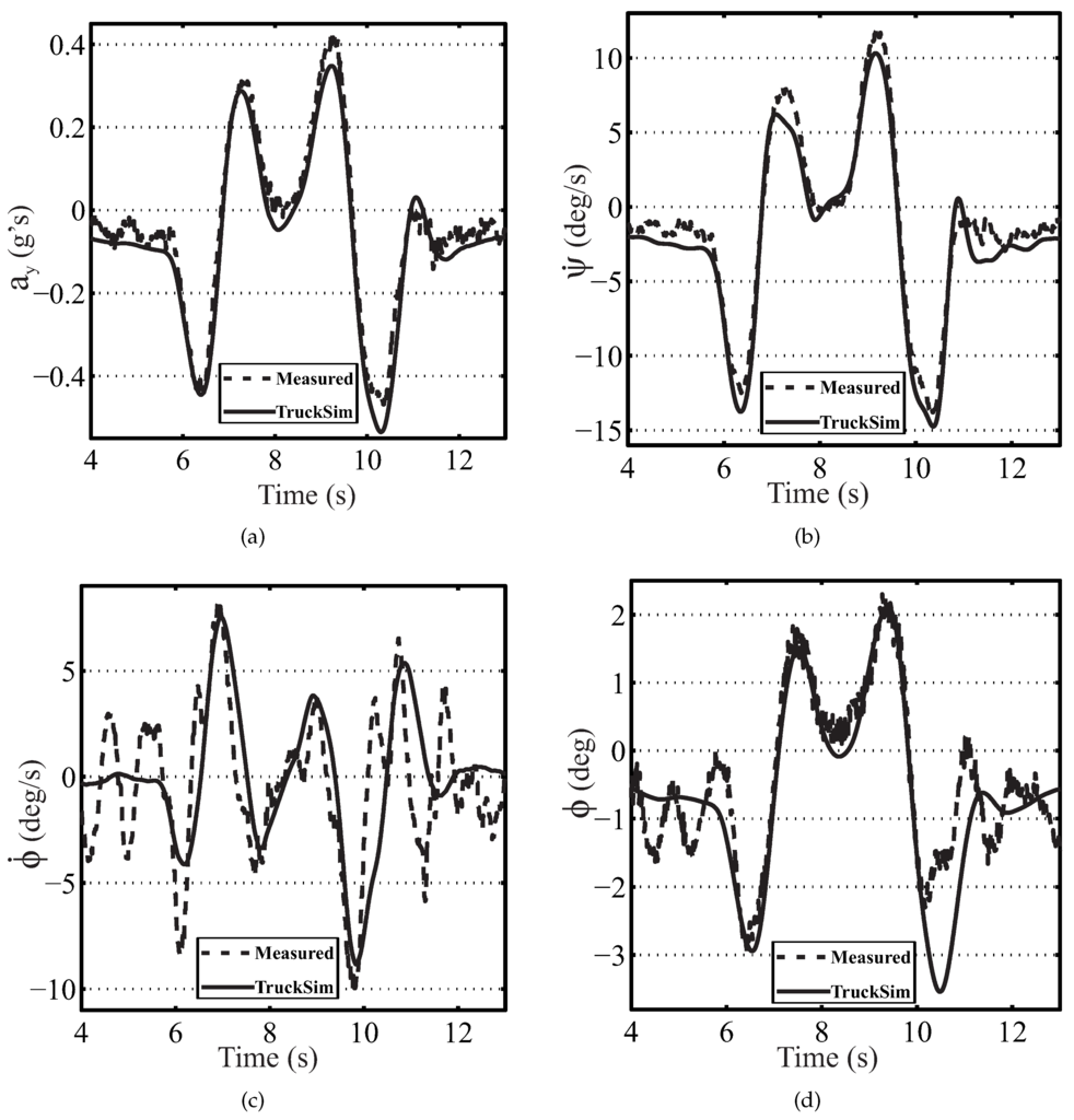 The performance of the vehicle model was proven in both the DLC and LC maneuvers with vehicle speeds of 50 and 70 km/h on dry pavement. Figure 6 shows the comparative results for the TruckSim simulation vehicle model using the experimental data obtained during a DLC maneuver for the real vehicle traveling at 70 km/h. The figure indicates excellent agreement between the simulation and the experimental results.