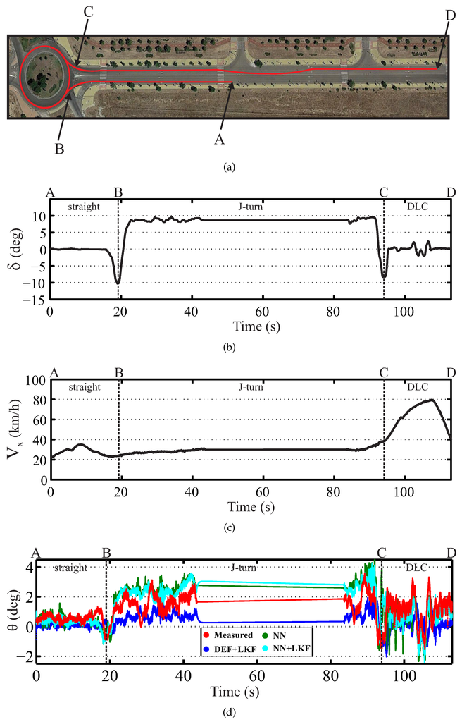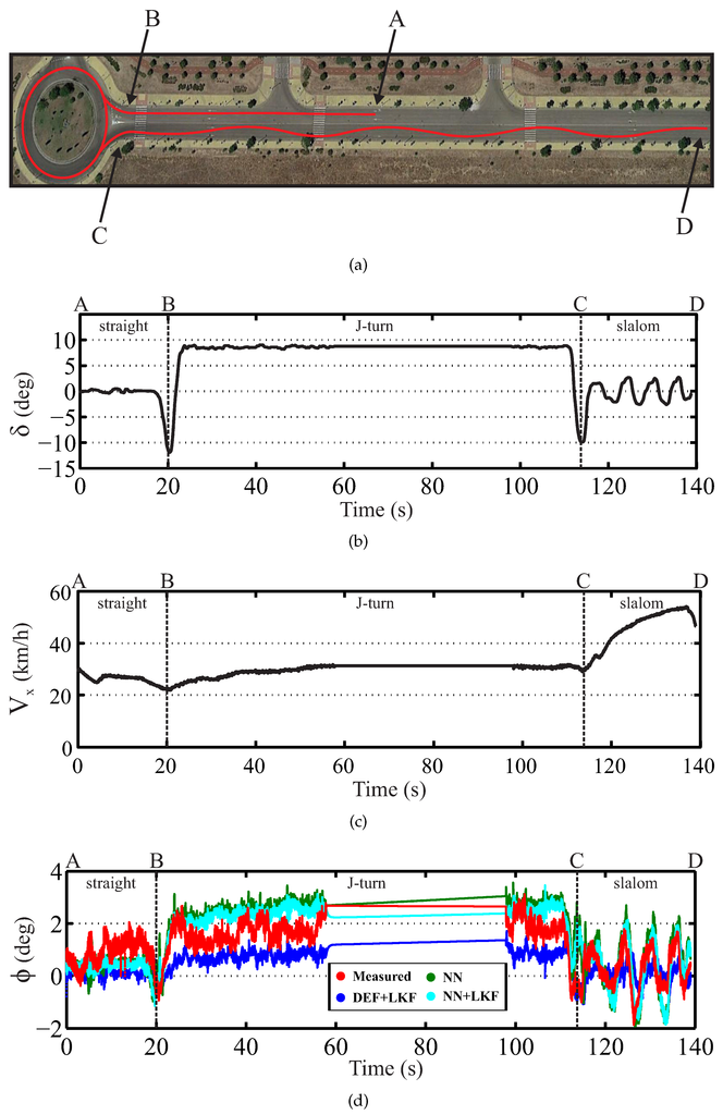 The first test corresponds to a real vehicle traveling on dry pavement under a J-turn and slalom maneuvers and the second one to the same vehicle under a J-turn and DLC. Figure 11a shows a J-turn and slalom maneuvers, while Figure 12a depicts a J-turn and DLC maneuvers. Table 6 and Table 7 show the norm and maximum errors. The proposed NN + LKF-based estimator proves to be better than the suspension deflection and single NN estimators, for both the norm and maximum errors.