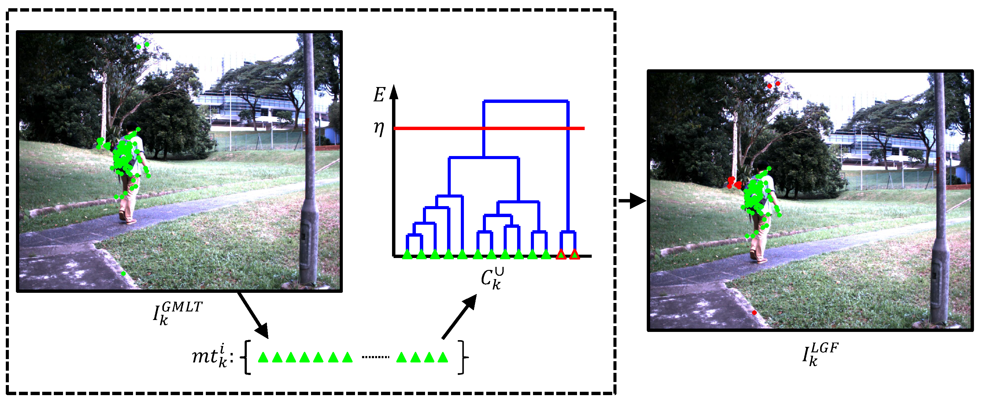 It defines the cluster dissimilarity S as the minimum among all of the forward-backward pairwise dissimilarities between the two correspondences of the two clusters. A dendrogram generated from the single-link HAC approach is shown in the middle of Figure 2; the is divided into some subgroups based on a cut-off threshold η, and the biggest subgroup is considered as the correspondences for the target object. The green points shown on the right side of Figure 2, i.e., , are the FAST features output from the LGF module, denoted as , where , , while the red points are the outliers.