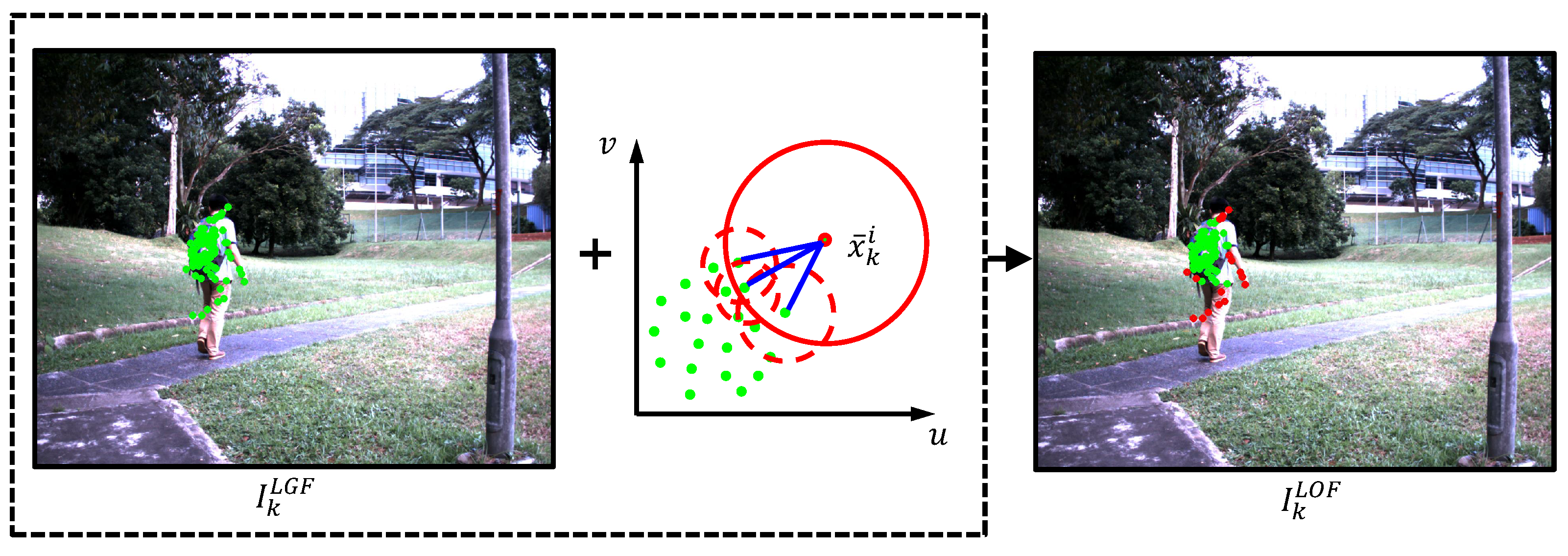 Illustration of local outlier factor (LOF) module. The green points on the are the FAST features from the LGF module, i.e., . The LOF module is developed to further remove the outliers, as the red points shown on the . The green points on the are final reliable output FAST features in our visual tracking application.