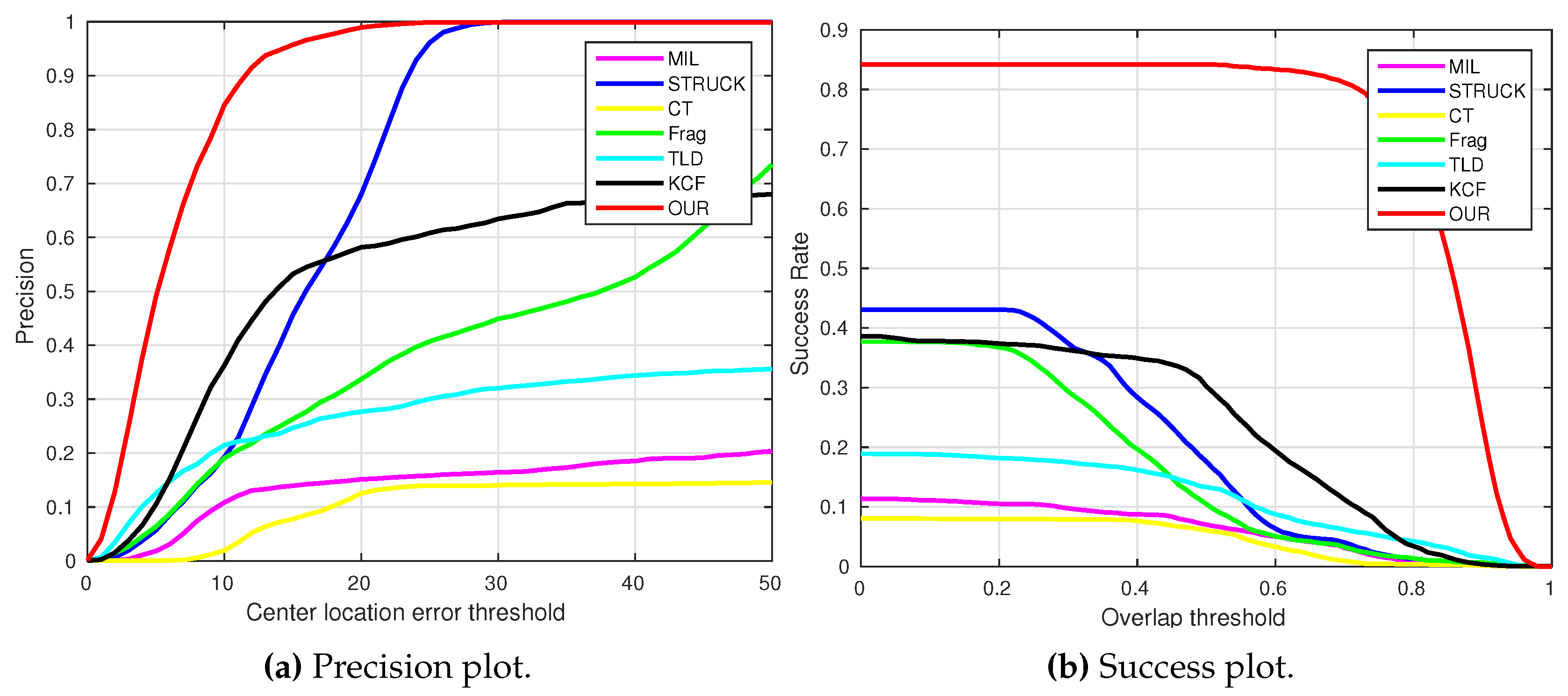 Figure 24 shows the overall performances of all visual trackers in 11,646 image frames with precision and success plots. It can be seen that our presented tracker has obtained the best performance. In addition, the KCF and Frag trackers are ranked No. 2 and No. 3.