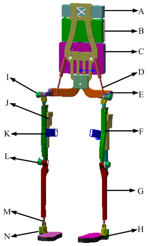 Mechanical structure of the exoskeleton. A: battery power source; B: control system enclosure; C: carried load; D: springs connecting the backpack with the waist part; E: waist part; F: thigh segment; G: shank segment; H: wearable shoes which have pressure sensors; I: optical encoder on the hip joint; J: actuation system consisting of DC motor, gear ratio and screw; K: connection cuff interacting with human limbs; L: optical encoder on knee joint; M: ankle joint; N: signal transfer for foot pressure.