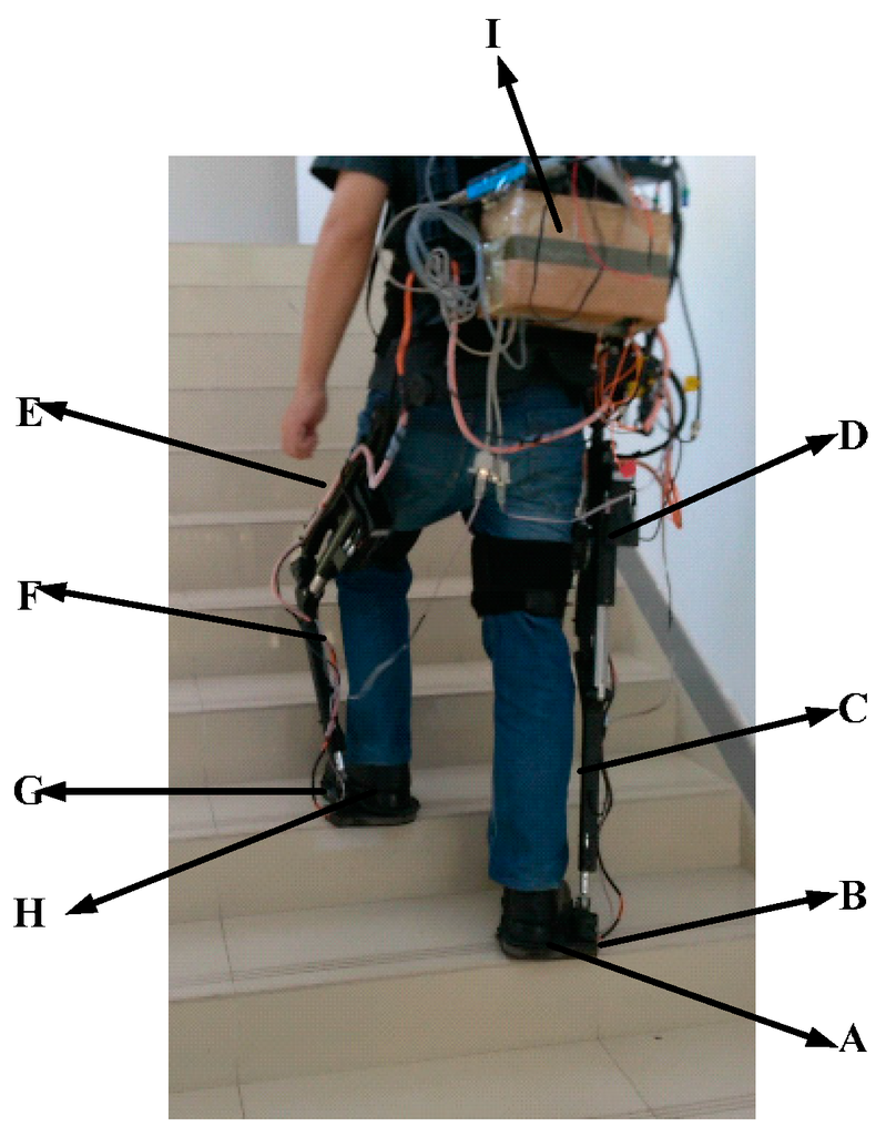 Mechanical structure of the robot used in this study. A and H: wearable shoes where three pressure sensors are placed in each; B and G: AHRS sensors which collect the inclination angles of foot for double legs; C and F: AHRS sensors which are attached to the leg segments to collect the inclination angles of shanks; D and E are motors with screws for the system; I: the central control system which collects data and produces control signals.