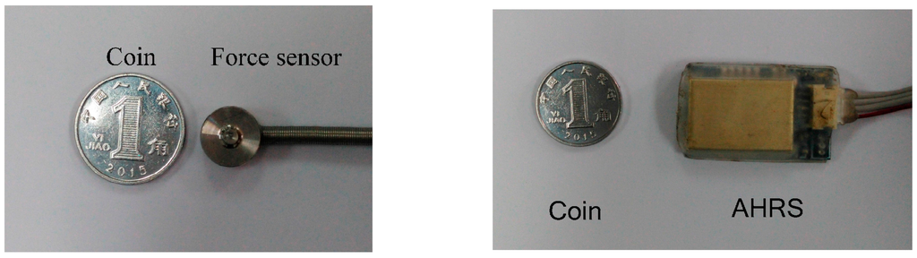 The GRF sensor and the AHRS sensor of the system, which are small and thin to be embedded in the mechanical structure.