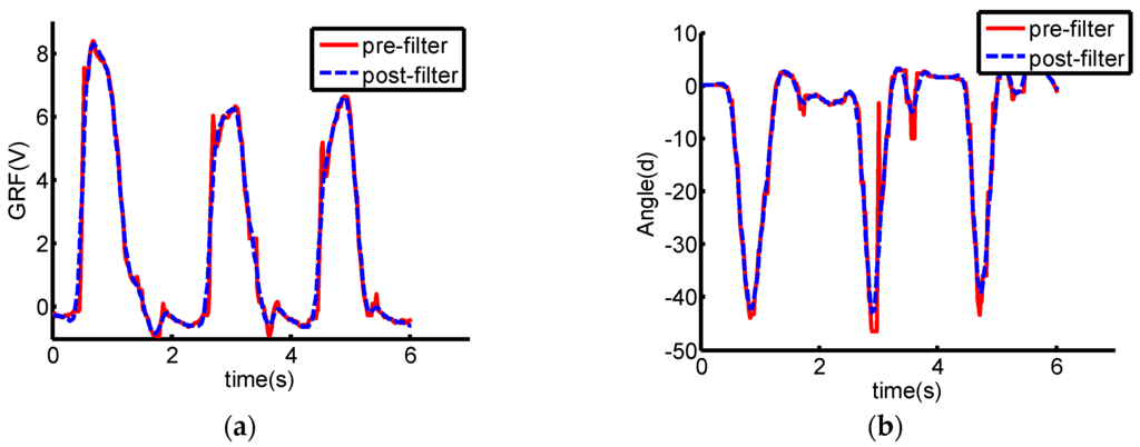 Signal curves comparison between pre-filter and post-filter. Signals through filter are smoother. (a) GRF curves from the sensor placed on the heel; (b) Inclination angle curves from the AHRS on the foot.