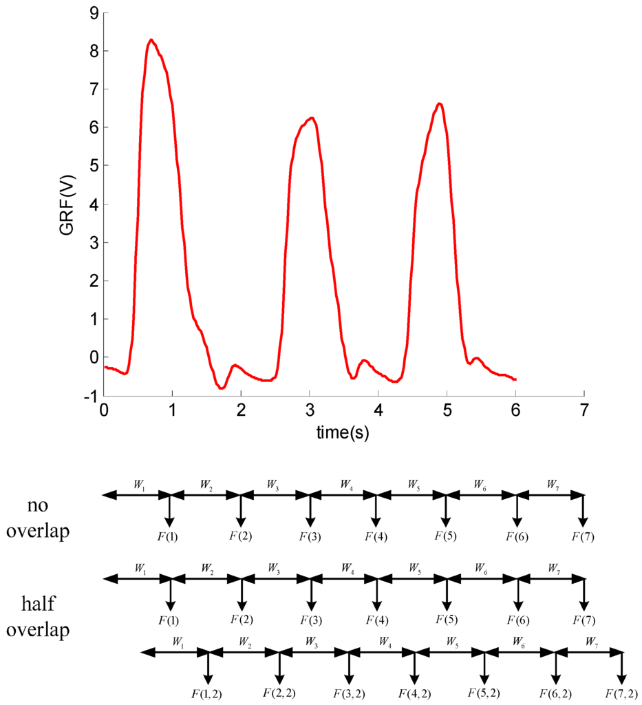 where Fs1, Fs2 and Fs1 are the three GRFs of the stance leg, θTs and θAs are the inclination angles of the thigh and the foot in the stance leg and θT and θA are the inclination angles of the other leg. Based on the phase identification, the features of the classifier are composed of GRF signals in the swing phase and the inclination angles of the leg segments. The simple amplitude of signals and its phase sequence are limited to identify locomotion modes. Feature extraction is the process of extracting useful information from the filtered signals. Features can be extracted from a time series of sensor signals. A time series is a series of observations of sensors shown as follows: