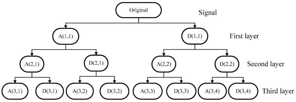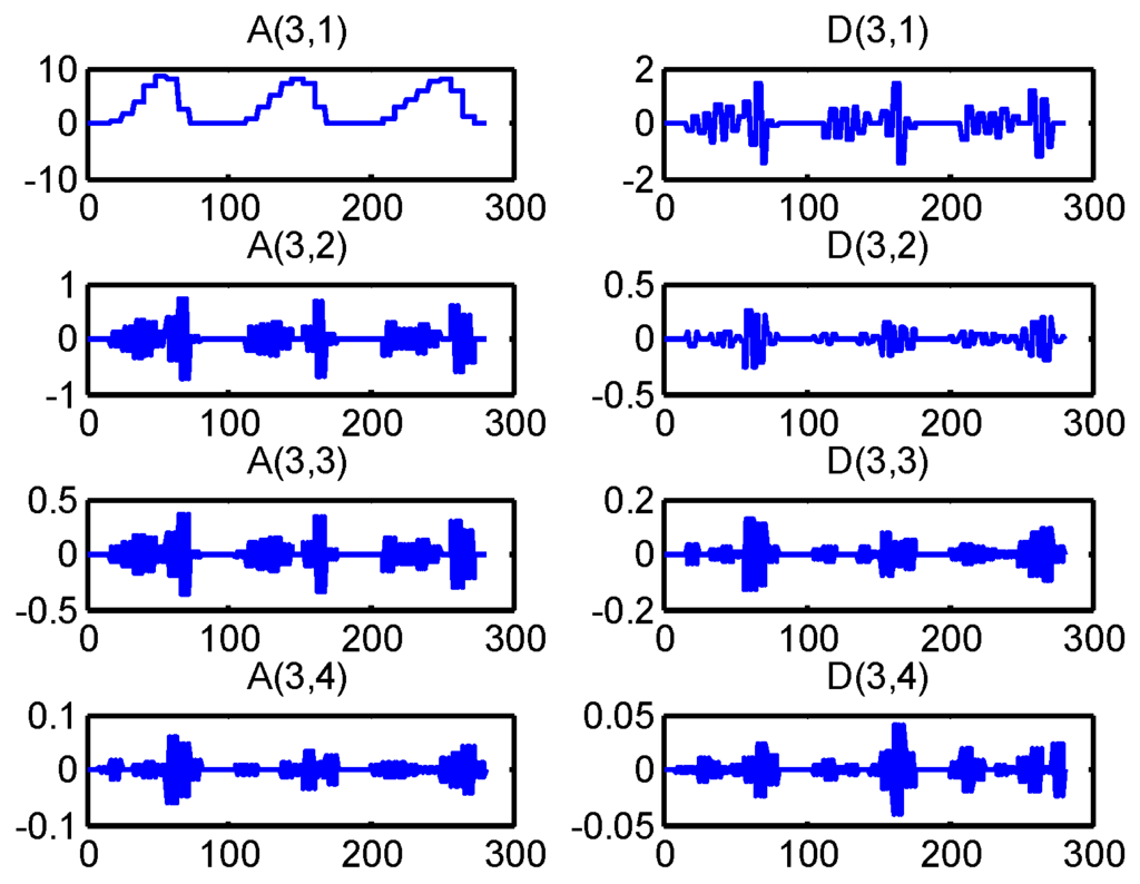 As discussed above, the windowing and the features extraction for a time series observations are shown in Figure 7. This decomposition tree of the wavelet packet is shown in Figure 8.