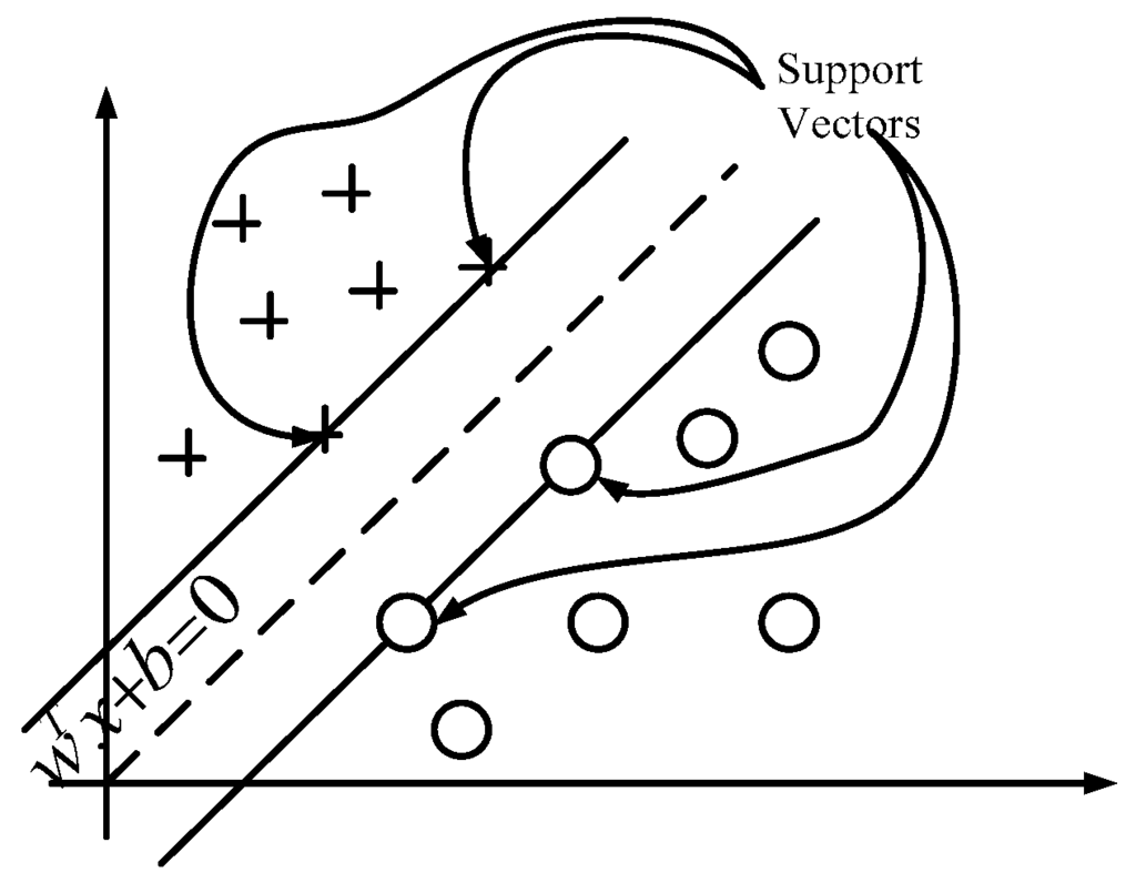 Support vector machine (SVM) is a general supervised learning method, which is used to solve problems of classification and regression [20]. SVM is considered as a highly efficient classifier and can replace the multi-layer perceptron, RBF neural network, the polynomial network and other existing learning algorithms [38]. The main paradigm for classification problem is to find an optimal separating hyper-plane as a decision boundary, with which the margin of separation among classes can be maximized. As Figure 10 shows, two classes classification problem by SVM is presented. There are two classes labeled +1 and–1, which are represented by “cross” and “circle” respectively. The target of SVM is to find the support vector to separate those two classes. The binary classifier can be extended for multi-classes classifier. For a k-class problem, these methods design a single objective function for training all k-binary SVMs simultaneously and maximize the margins from each class to the remaining ones.